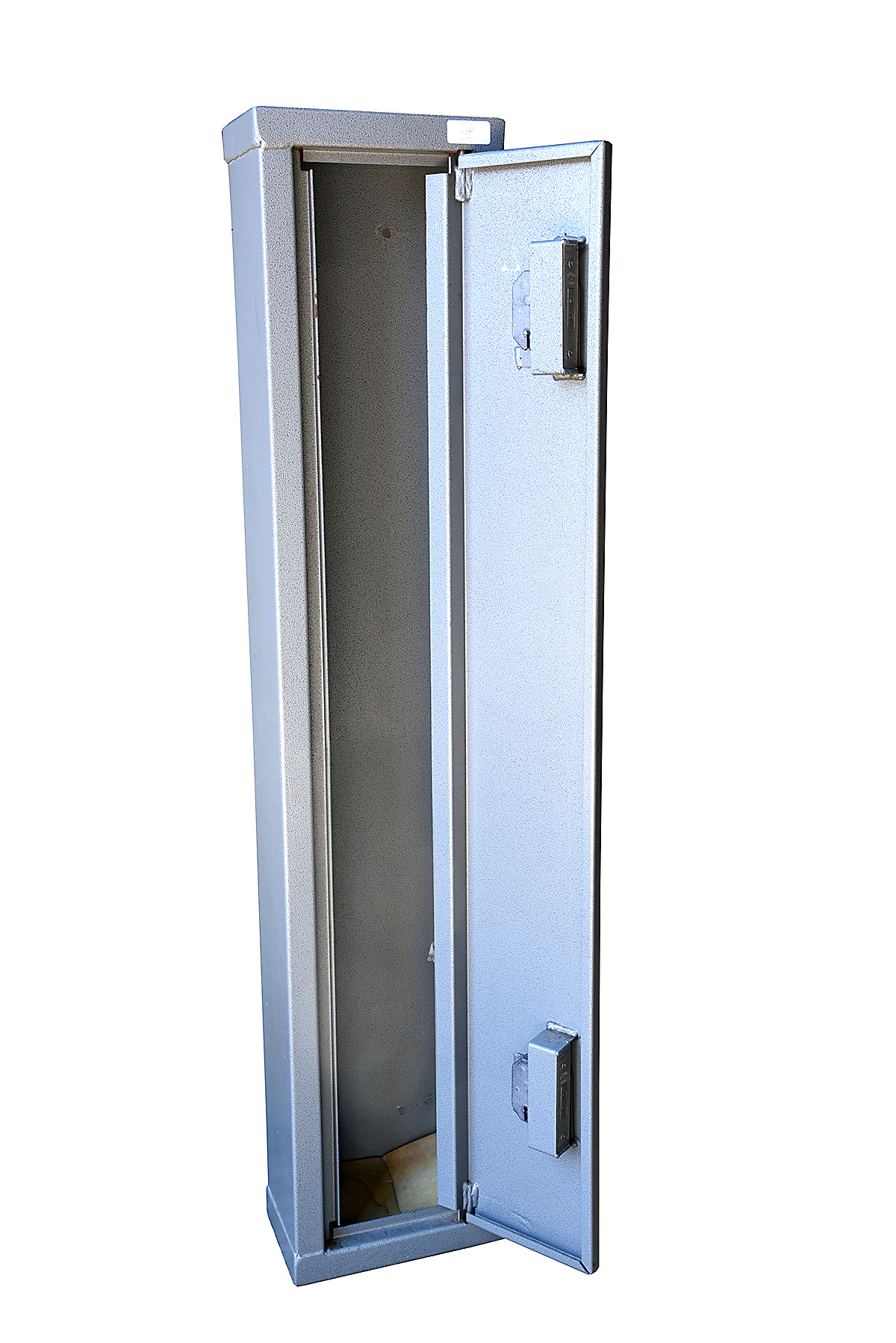 A STEEL GUN CABINET, suitable for one gun, measuring approx. 50in. x 10in. x 6in.