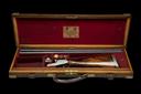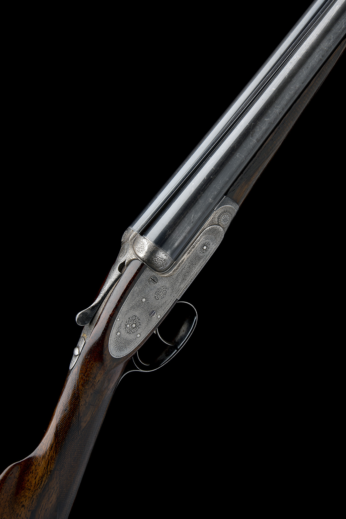 for 1918, 28in. Whitworth-steel nitro chopperlump barrels, the rib engraved 'J. PURDEY & SONS. AUDLEY HOUSE. SOUTH AUDLEY STREET. LONDON. MADE OF SIR JOSEPH WHITWORTH'S FLUID PRESSED STEEL' (rubbed), 2 1/2in. chambers, bored approx. 1/4 and 3/4 choke, bore dimensions marginal, some pits and dents, rounded bar action with removable striker discs, automatic safety with gold-inlaid 'SAFE' detail, cocking-indicators, best fine acanthus scroll engraving with floral bouquets, retaining very slight traces of original colour-hardening, 13 3/4in. figured stock including 1 1/4in. rubber recoil pad, weight 6lb. 4oz., in its brass-cornered oak and leather case