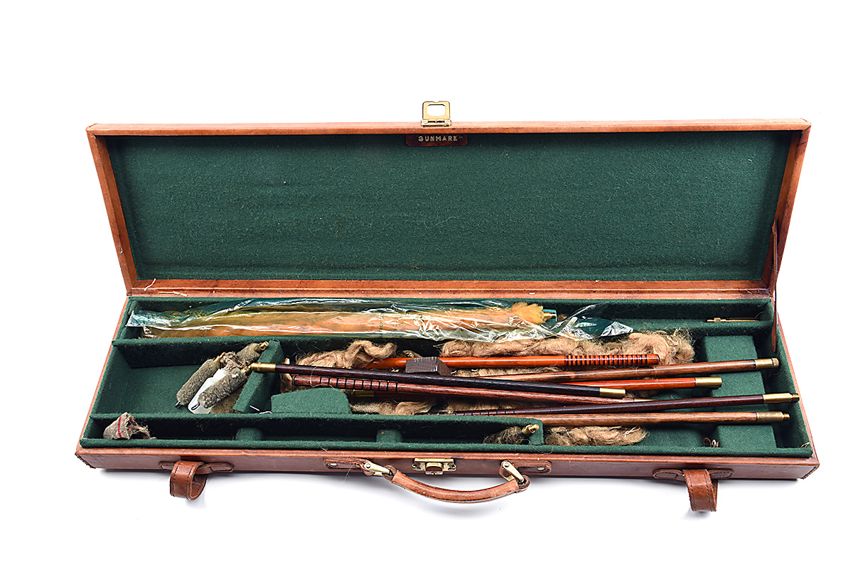 A GUNMARK LEATHER SINGLE GUNCASE, fitted for 30in. barrels, the interior lined with green baize, single clasp lock, together with a collection of cleaning rods