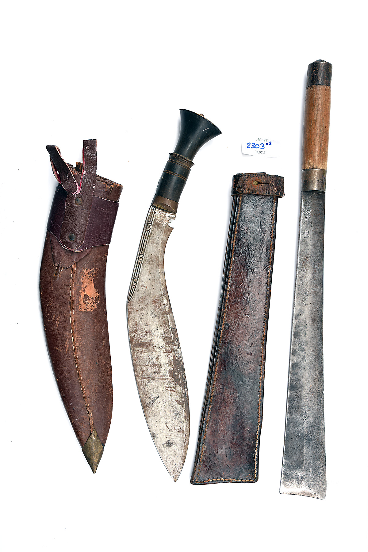 AN INDIAN MILITARY 'PARANG' TYPE MACHETE AND A KUKRI KNIFE, the first with flat-ended 14in. blade marked 'IMG' with a broad arrow, dated 1943 and marked 'SIMCO', round section wood hilt complete with its leather scabbard dated 1941, the second circa 1950s also with leather scabbard
