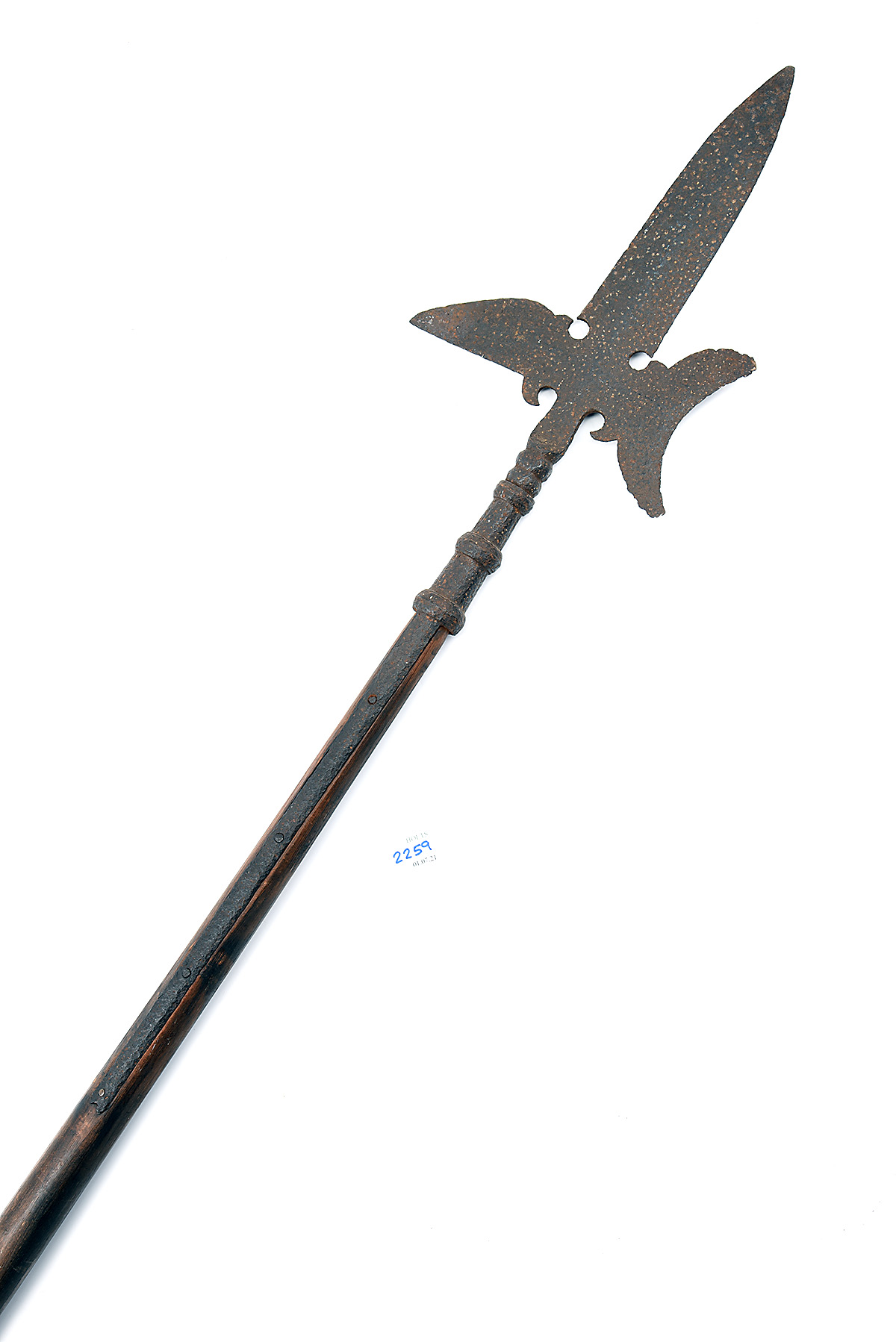 AN 18TH CENTURY HALBERD possibly a Sergeants polearm, with a crescentic cutting edge backed with an armour-piercing blade and topped with a wide, double-edged spear-point, the whole in excavated condition (some losses to definition) with long tangs and iron ring reinforcement, fitted to a later shaft