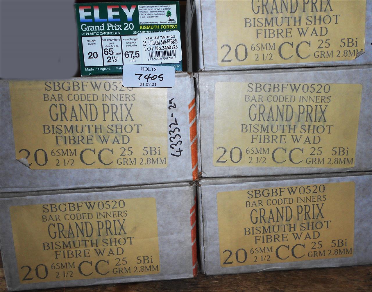 1250 20 BORE ELEY GRAND PRIX BISMUTH CARTRIDGES, 67.5mm, 25grm, 5 Bi. SHOT, FIBRE WAD, Please be advised that cartridges/ammunition, primers, primed cases, blanks and percussion caps cannot be sent to you by post or carrier. If you wish, you can book a collection at one of our regional valuation days, or collect from our offices at PE31 6HA in Norfolk