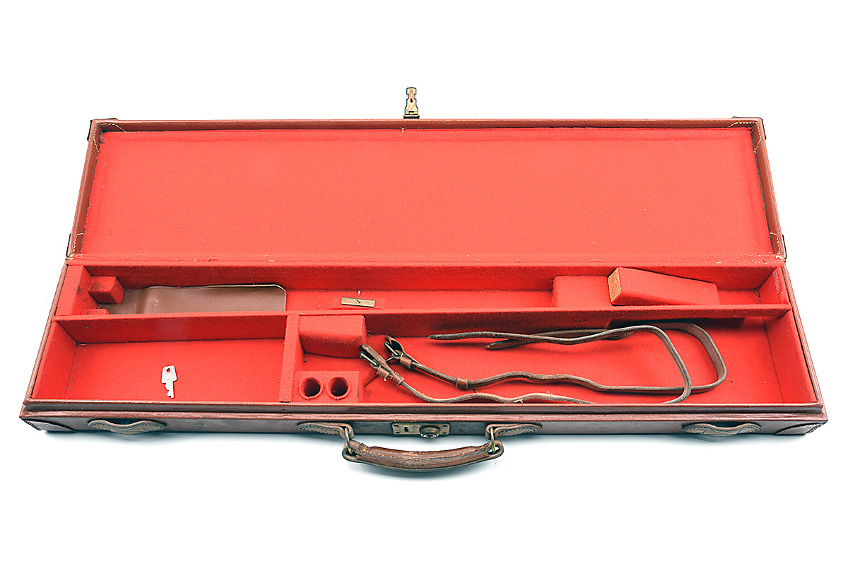 A SINGLE LEATHER GUNCASE, fitted for 30in. barrels, the interior lined with red baize, brass lock (including key),
