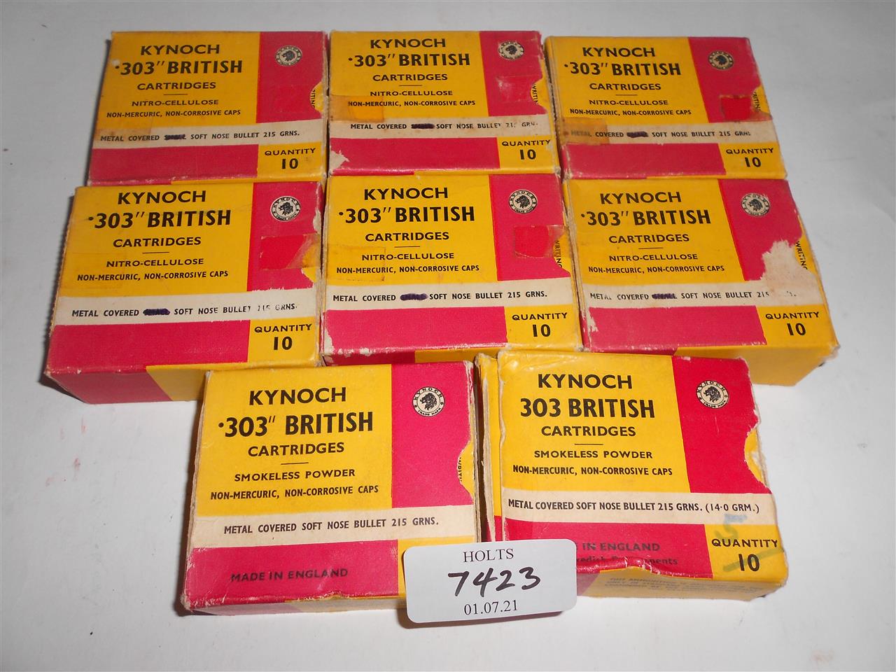 75 ROUNDS .303 215 grn, SOFT NOSE AMMUNITION BY KYNOCH IN ORIGINAL RETAIL CARTONS Please be advised that cartridges/ammunition, primers, primed cases, blanks and percussion caps cannot be sent to you by post or carrier. If you wish, you can book a collection at one of our regional valuation days, or collect from our offices at PE31 6HA in Norfolk