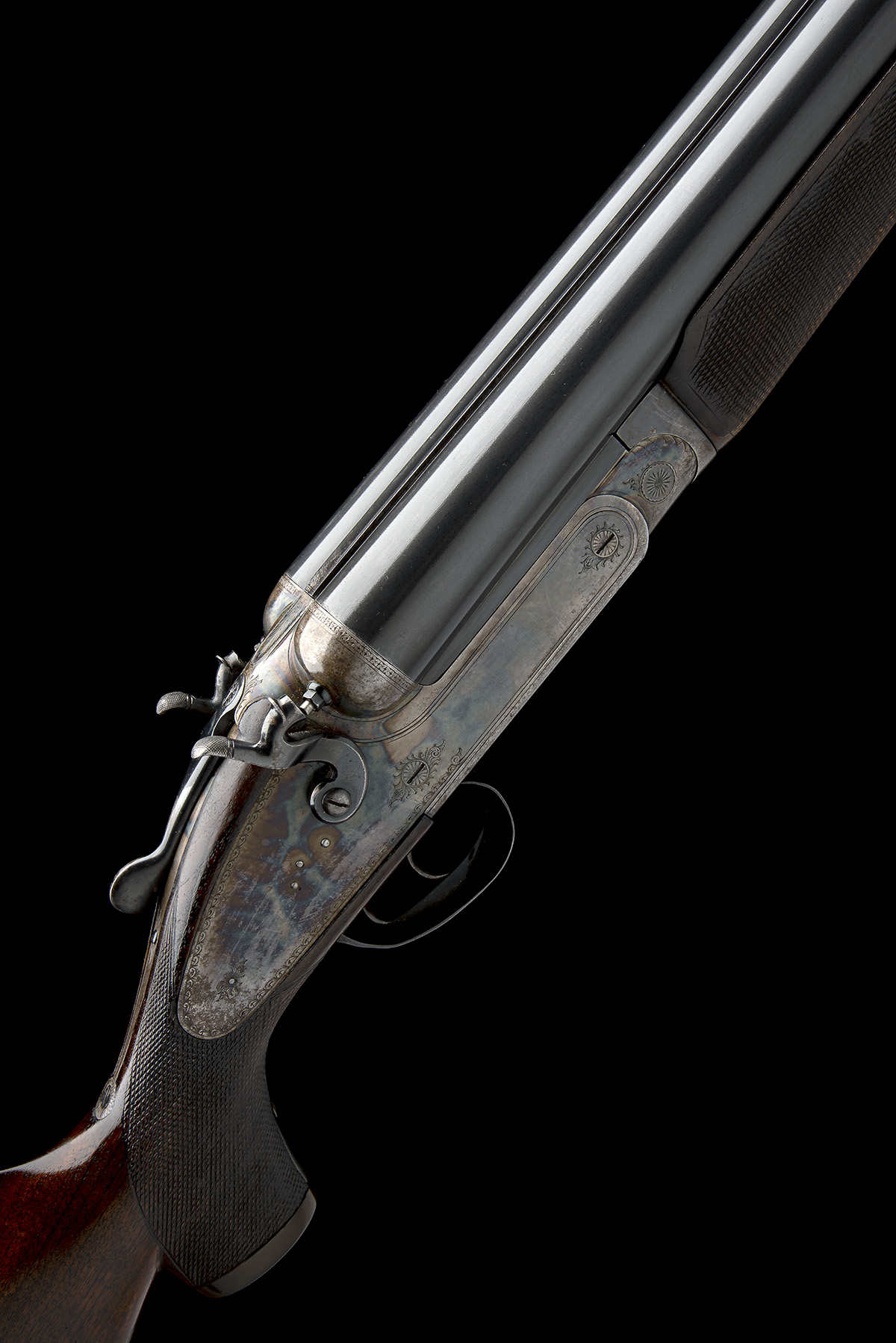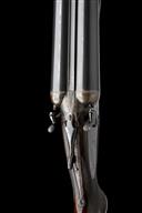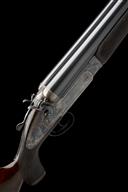 for 1980, 35 7/8in. nitro barrels, 4 1/2in. chambers, fences with protruding striker nipples, rebounding sidelocks, border engraving, the lockplates gold-inlaid 'A. MYERS', retaining much original colour-hardening, 14 1/2in. pistolgrip stock with horn pistolgrip-cap and buttplate, beavertail fore-end, weight 24lb.