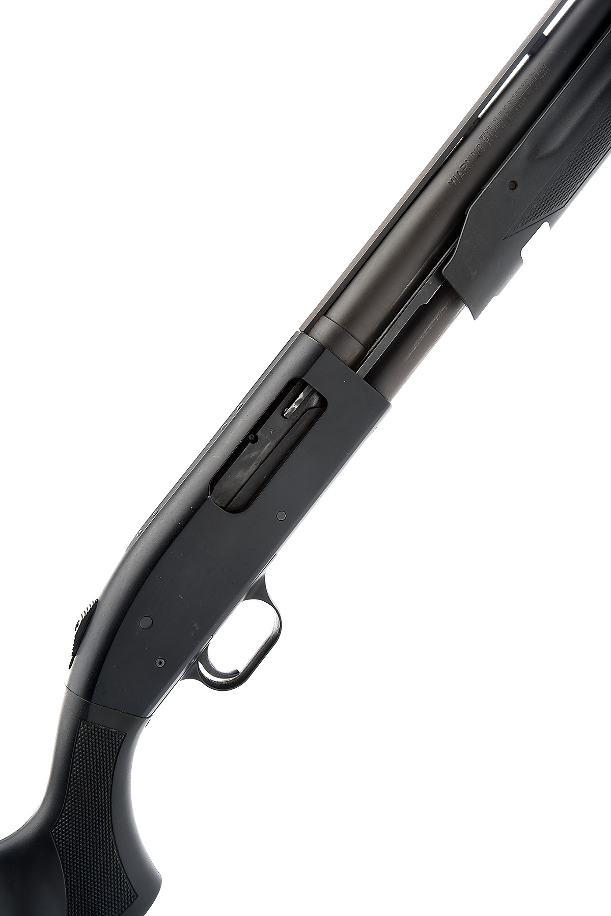 MOSSBERG 12-BORE (3IN.) '500' MODERATED PUMP-ACTION SHOTGUN, serial no. U281582, for 2013, 35 1/4in. steel-shot proofed nitro barrel including sound moderator, 3in. chamber, manual top tang safety, 14in. synthetic pistolgrip stock including ventilated rubber recoil pad, the whole in matt black finish, weight 7lb. 14oz.