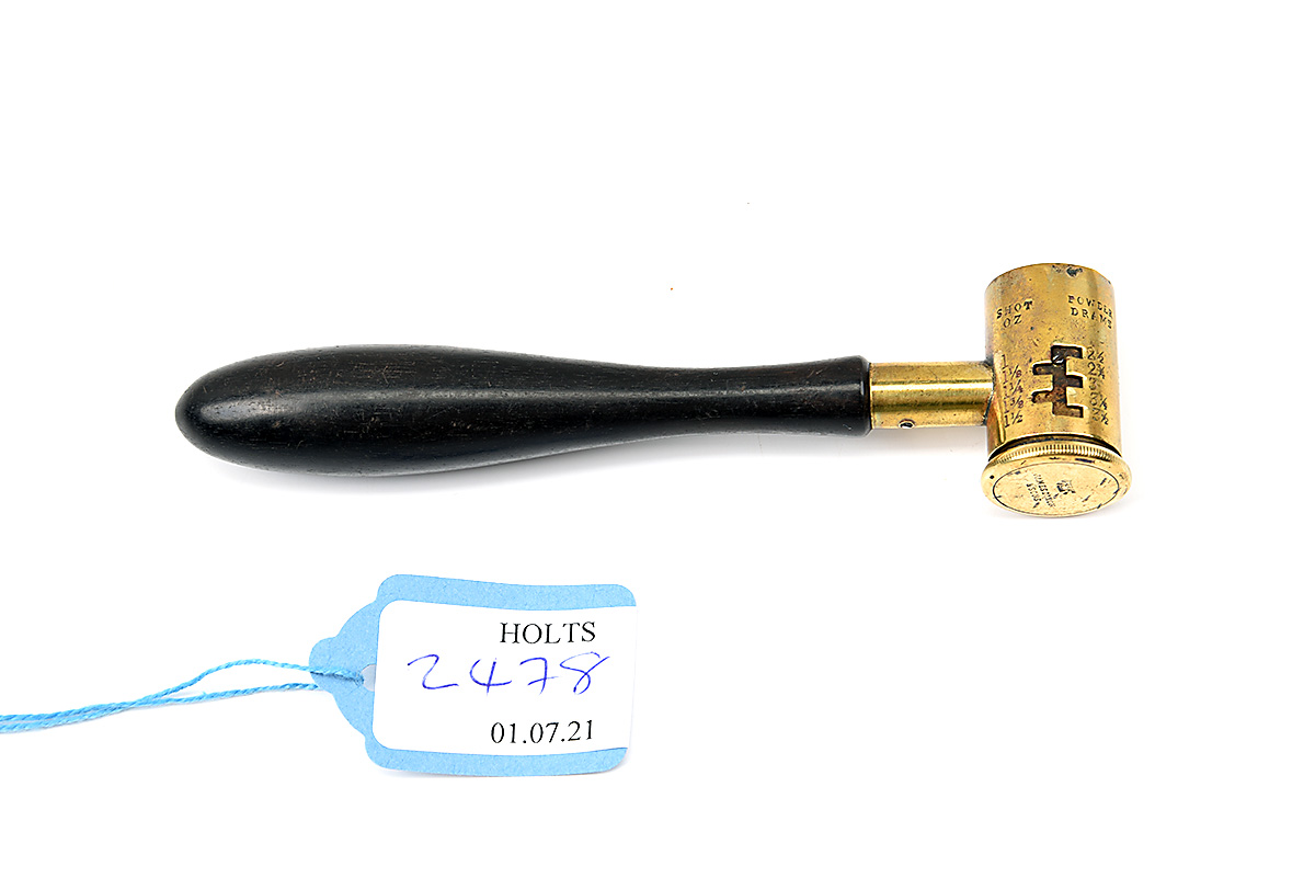 A SCARCE COMBINED POWDER AND SHOT MEASURE SIGNED 'JAMES DIXON & SONS', circa late 19th Century, turned ebony handle with brass scoop with five graduations for 'SHOT / OZ' on left from 1 to 1 1/2 in 1/8 increments and 'POWDER / DRAMS' on right from 2 1/2 to 3 1/2 with base marked with the Dixon 'trumpet and banner' trade mark with JAMES DIXON / & SONS' below, 5 1/4 in.