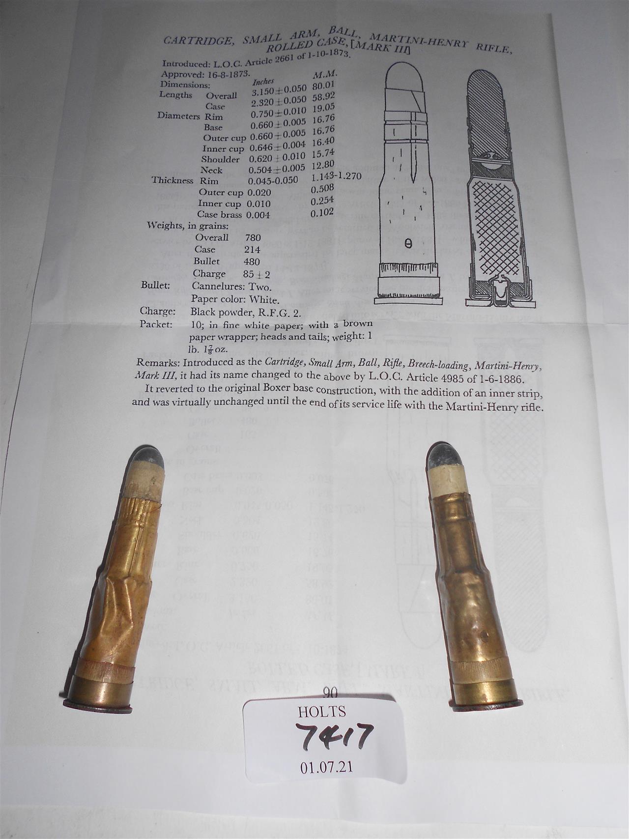 A PAIR OF RARE ZULU WAR PERIOD ROLLED BRASS INERT UNFIRED CARTRIDGES FOR THE MARTINI HENRY RIFLE, 1870s, one Mark I and one Mark III, the Mk I was of comprised of a single roll of brass, the Mk III had a double-roll with a small oval 'window' stamped out of the exterior roll to show the existence of the inner roll to allow it to pass inspection (the Mk II cartridge was experimental only and not issued for service), the Mk III also has a pair of Ordnance 'Broad Arrow' marks stamped into the rim of the primer cup, both have had the black powder charge removed and the primer made inert