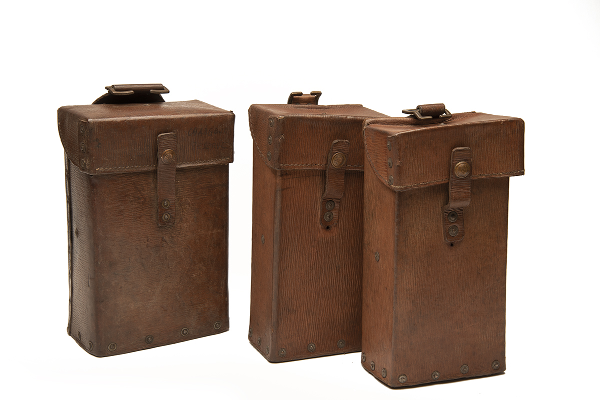 A GROUP OF UNIDENTIFIED BROWN LEATHER MILITARY MAGAZINE POUCHES believed post WWII, possibly Indian, with brass studs, two 4 1/2in. x 9 1/2in. x 2 3/4in. with carrying straps, and one 5 1/2in x 9 1/4in. x 3 1/2in., worn