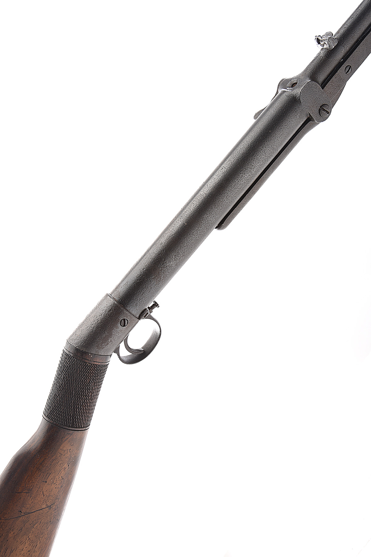 A .177 UNDER-LEVER AIR-RIFLE SIGNED BSA, MODEL 'THE BSA AIR-RIFLE IMPROVED MODEL 'D'', serial no. 31002, for 1909, with 19 1/4in. sighted barrel, tap-action breech, plain air-chamber marked with the maker and model details, chequered walnut straight hand stock and 'spade' catch underlever, pitting to exposed iron surfaces