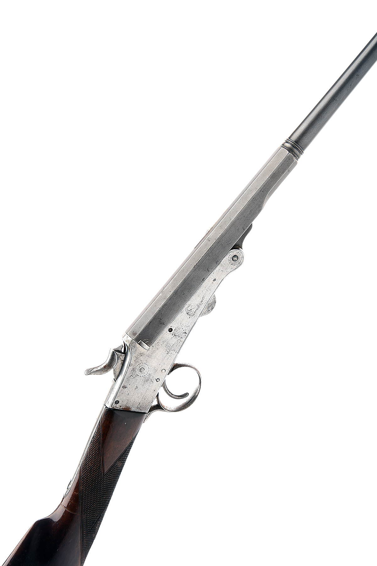 UNSIGNED .410 (SMOOTHBORED) CONVERTED 'TRANTER'S PATENT' SINGLE-BARRELLED ROOK AND RABBIT RIFLE, serial no. 31217, circa 1895, 26in. nitro reproved turned octagonal to round barrel, rear-sight removed and dove-tail insert, 2 1/2in. chamber, bored approx. 1/2 choke, non-rebounding central hammer (tip snapped), border engraving, marked 'W. TRANTER'S PATENT. 35038', bright finish, 12 3/4in. stock