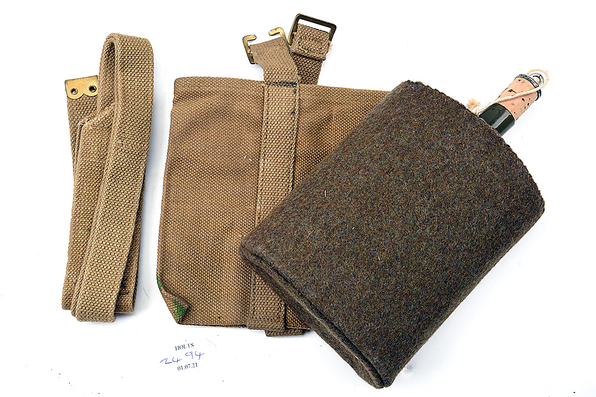 AN UNISSUED P-37 WATER-BOTTLE SET IN ORIGINAL PACKAGING, mid 1940s, consisting of a felt-covered bottle with cork stopper, canvas carrier dated 1944 and strap, all wrapped in original waxed paper and in their original 'W /I\ D' marked cardboard box, with ' W D 3321 / BOTTLES C/W CASE / P.P. 1 FA' stencilled to one end