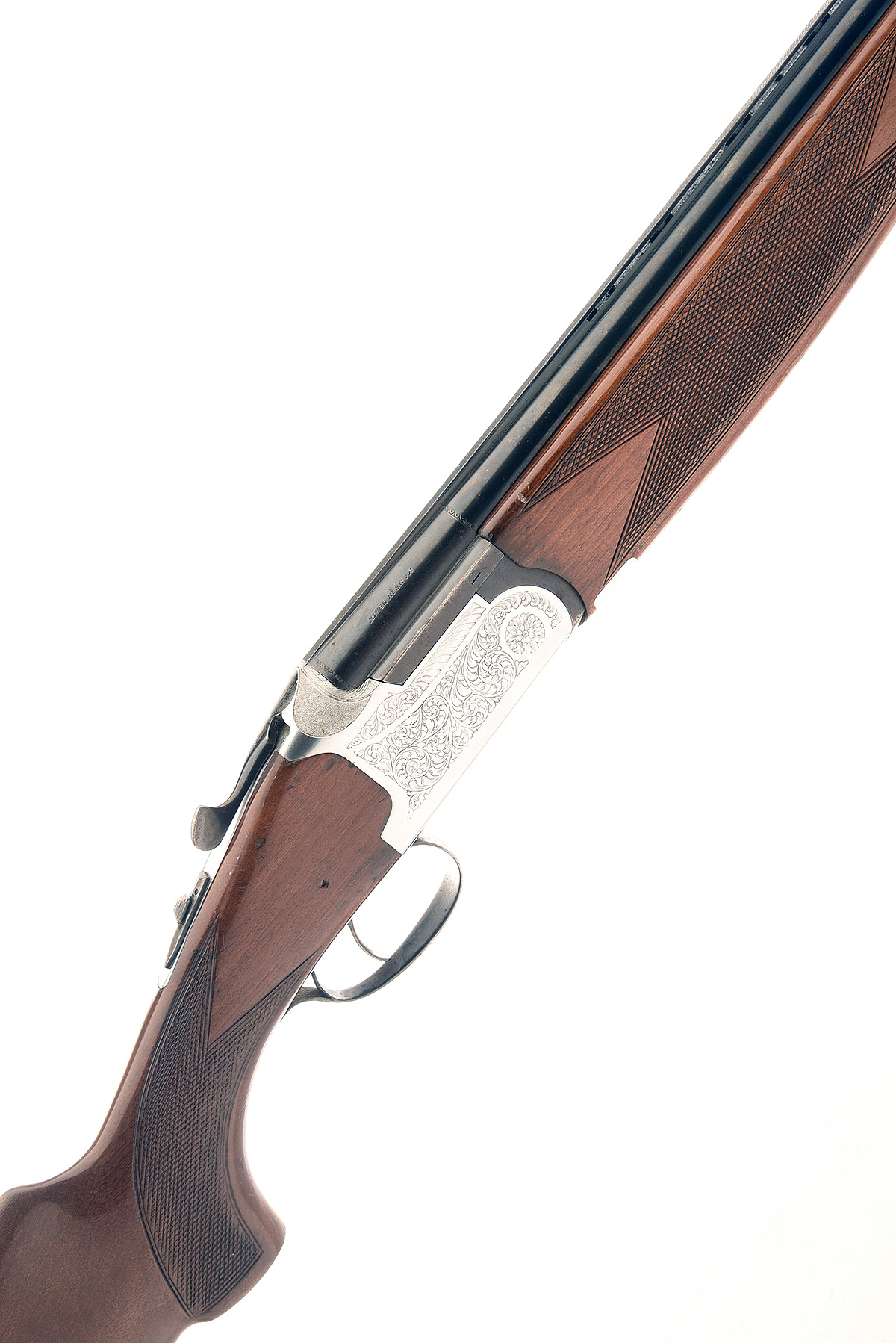 LANBER 12-BORE SINGLE-TRIGGER OVER AND UNDER EJECTOR, serial no. 161994, dated 1979, 27 1/2in. nitro barrels with 6mm ventilated matt top-rib, 2 3/4in. chambers, bored approx. imp. cyl. and 1/4 choke, hold-open toplever, automatic safety with integral barrel selector switch, acanthus scroll engraving, bright finish, 14in. pistolgrip stock including buttplate