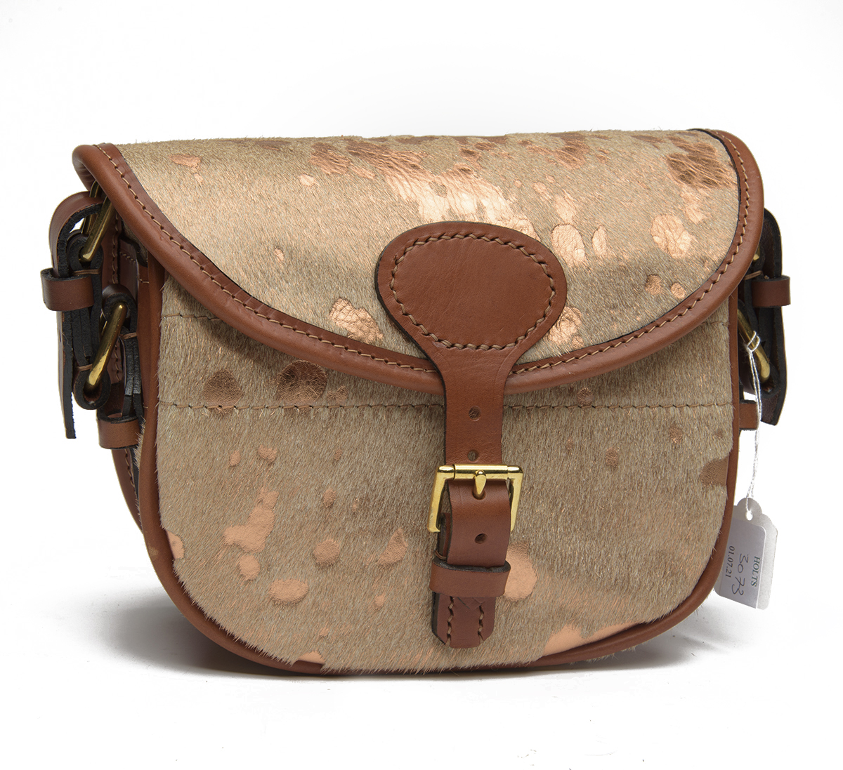 AN UNUSED FUR AND LEATHER SUEDE-LINED CARTRIDGE BAG,