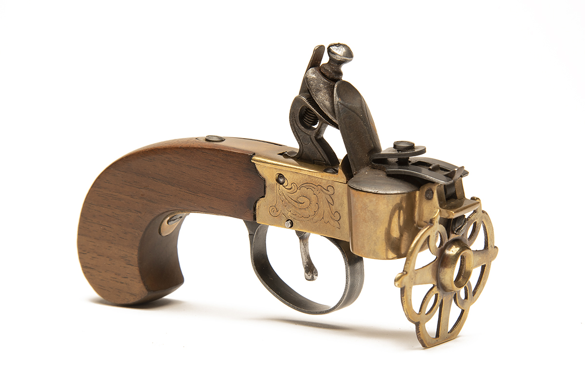 A REPRODUCTION BRASS TINDER-LIGHTER, 5 1/2in. overall, with slab-sided walnut butt and boxlock action