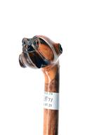 A GOOD VICTORIAN WALKING-STICK WITH BOXER-DOG CARVED POMMEL, circa 1880, 34in. overall, with plain chestnut shaft fitted with an iron-tipped ferrule, the pommel carved in a realistic depiction of a boxer dog's head with glass eyes