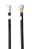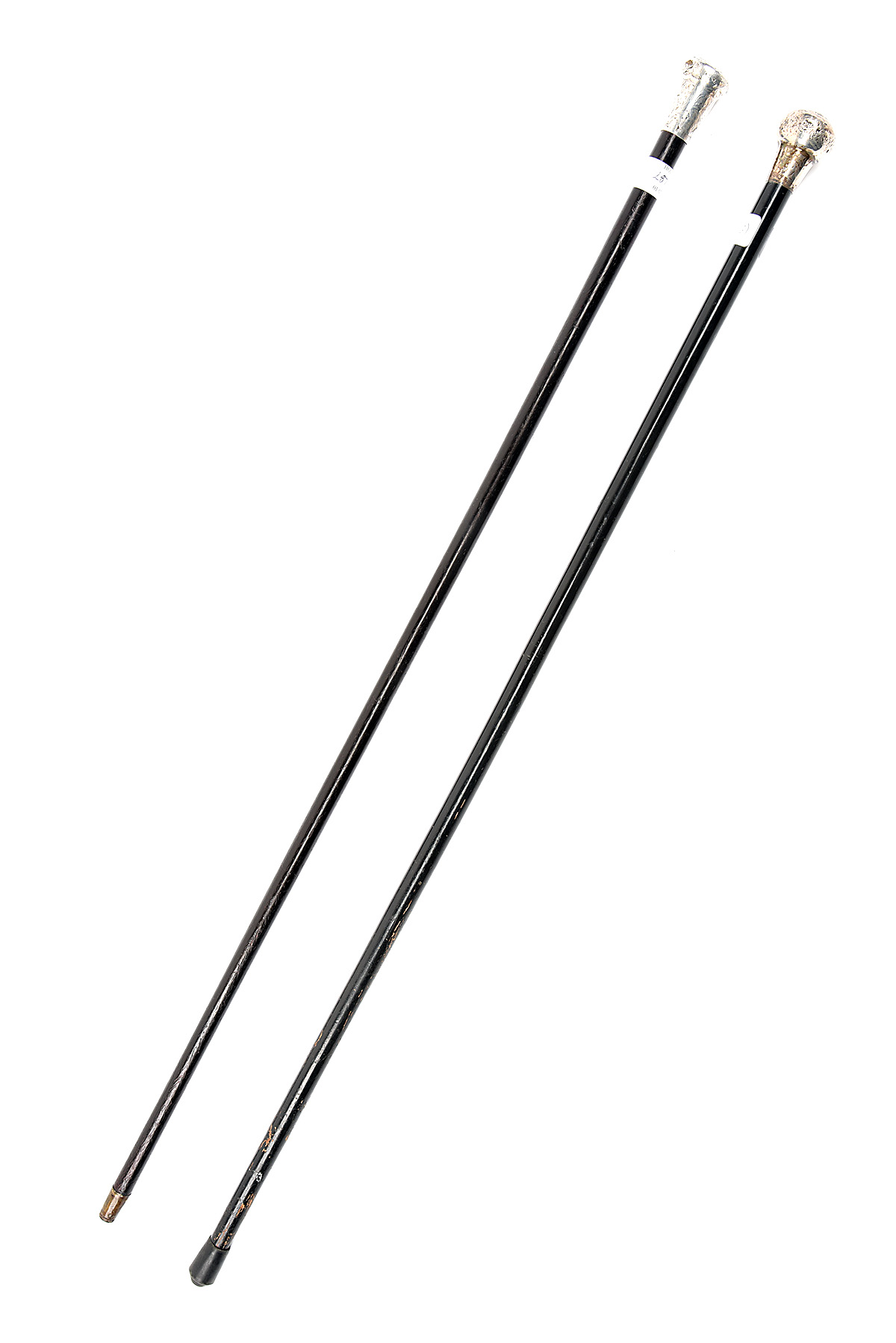 TWO SILVER-TOPPED EBONY WALKING-CANES, the first hallmarked for Jonathan Howell, London 1908, the other unmarked, both with bulbous pommels (one distressed), each approximately 36in. overall