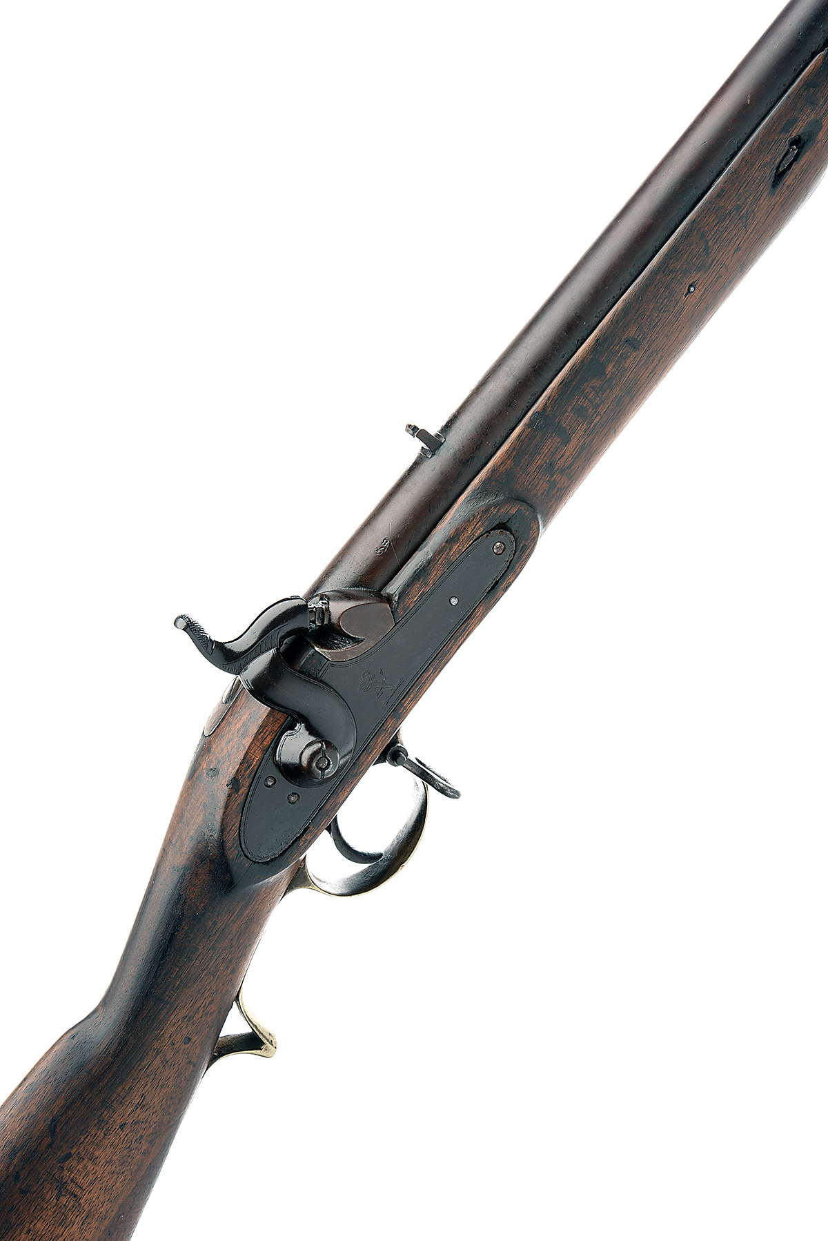A .750 PERCUSSION MUSKET FOR THE EAST INDIA COMPANY, UNSIGNED, MODEL 'PATTERN '42 TYPE 'E', no visible serial number, for between 1842-45, with browned iron 39in. barrel, block fore-sight, standing notch rear-sight, London proofs, borderline engraved bar-action lock of military style further marked with a rampant lion trademark forwards of the hammer, walnut full-stock with brass furniture, iron stirrup swivels, button headed ramrod and Hanoverian type bayonet catch, 54in. overall
