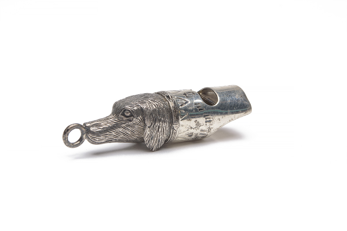 A SILVER DOG WHISTLE, in the form of a retriever head, the nose with lanyard ring, measuring approx. 1 5/8in.