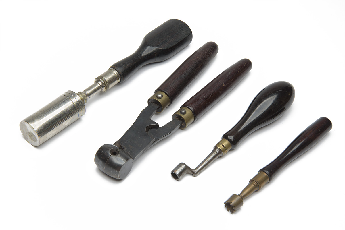 A SMALL COLLECTION OF GUNCASE ACCESSORIES, comprising of a percussion nipple cleaner, a 12-bore chamber brush, nipple key, ball bullet mould