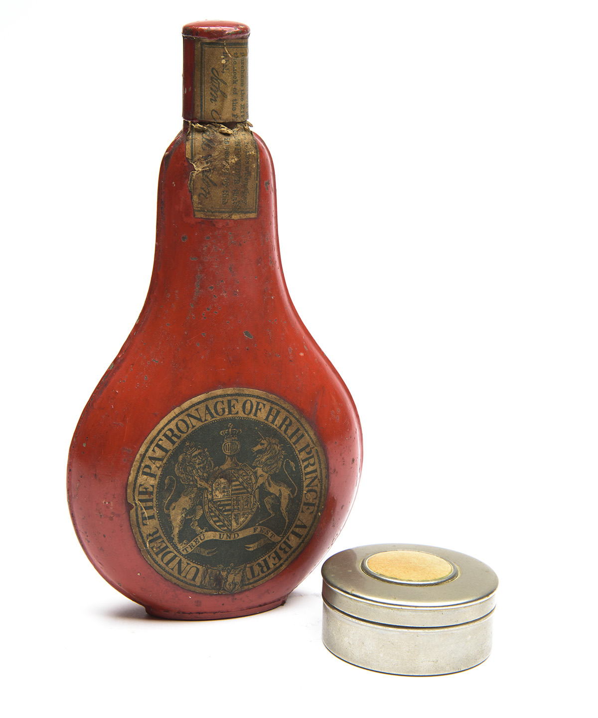 A JOHN HALL & SON GUN POWDER TIN IN THE FORM OF A POWDER FLASK,