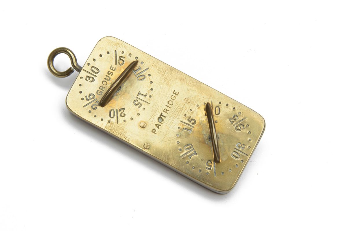 A VINTAGE 'NORFOLK LIAR' GAME COUNTER brass body with four revolving counters engraved 'HARES', 'PHEASANTS, GROUSE', 'PARTRIDGES', lanyard loop