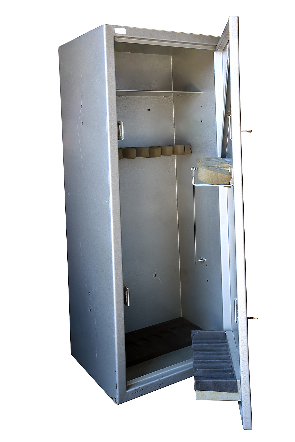 A STEEL GUN CABINETS, fitted to hold 15 guns, measuring approx. 54in. x 24in. x 18in.