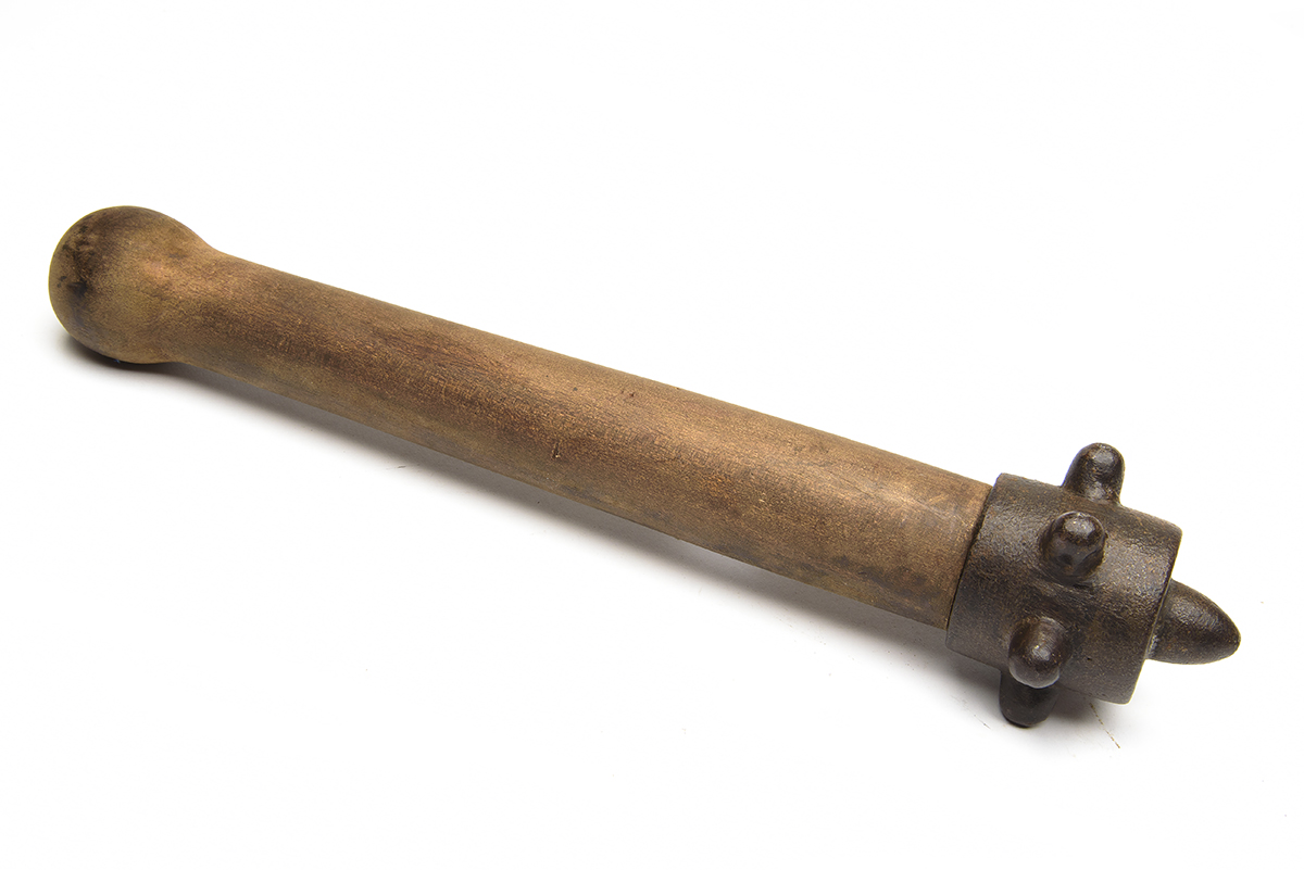 A WORLD WAR I TRENCH RAIDING MACE, circa 1916, with a six-pointed iron head with central boss-point attached to a wooden shaft, unmarked, 13 1/2in. overall