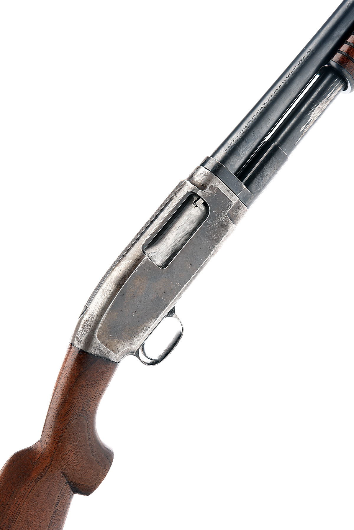 WINCHESTER 16-BORE 'MODEL 12' TAKE-DOWN PUMP-ACTION SHOTGUN, serial no. 785627, restricted magazine, 28in. nitro barrel, 2 3/4in. chamber, bored approx. 3/4 choke, plain action retaining traces of colour, trigger-mounted safety, 14 1/2in. pistolgrip stock including 1in. wooden extension, weight 6lb. 5oz.