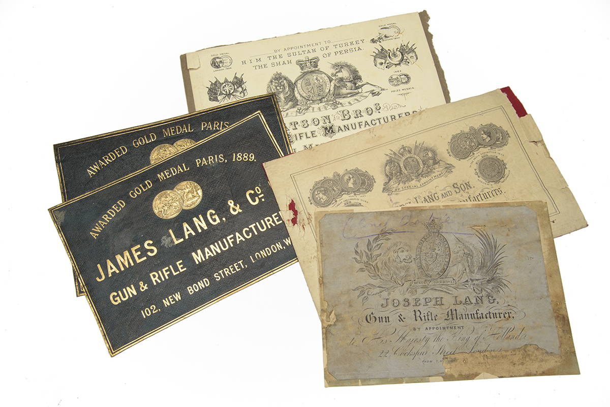 A COLLECTION OF OLD ENGLISH GUN MAKERS TRADE LABELS, comprising of Westley Richards, Watson Brothers, Henry Atkin, Joseph Lang & Son, James lang & Co. lang, Joseph Lang