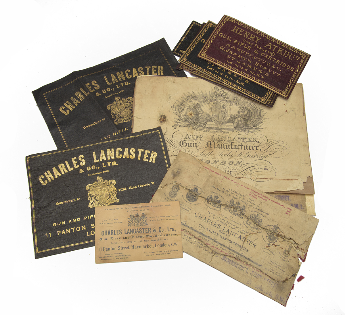 A COLLECTION OF OLD ENGLISH GUN MAKERS TRADE LABELS, comprising of 5 c Charles Lancaster, 3 x henry Atkin, Alf Lancaster