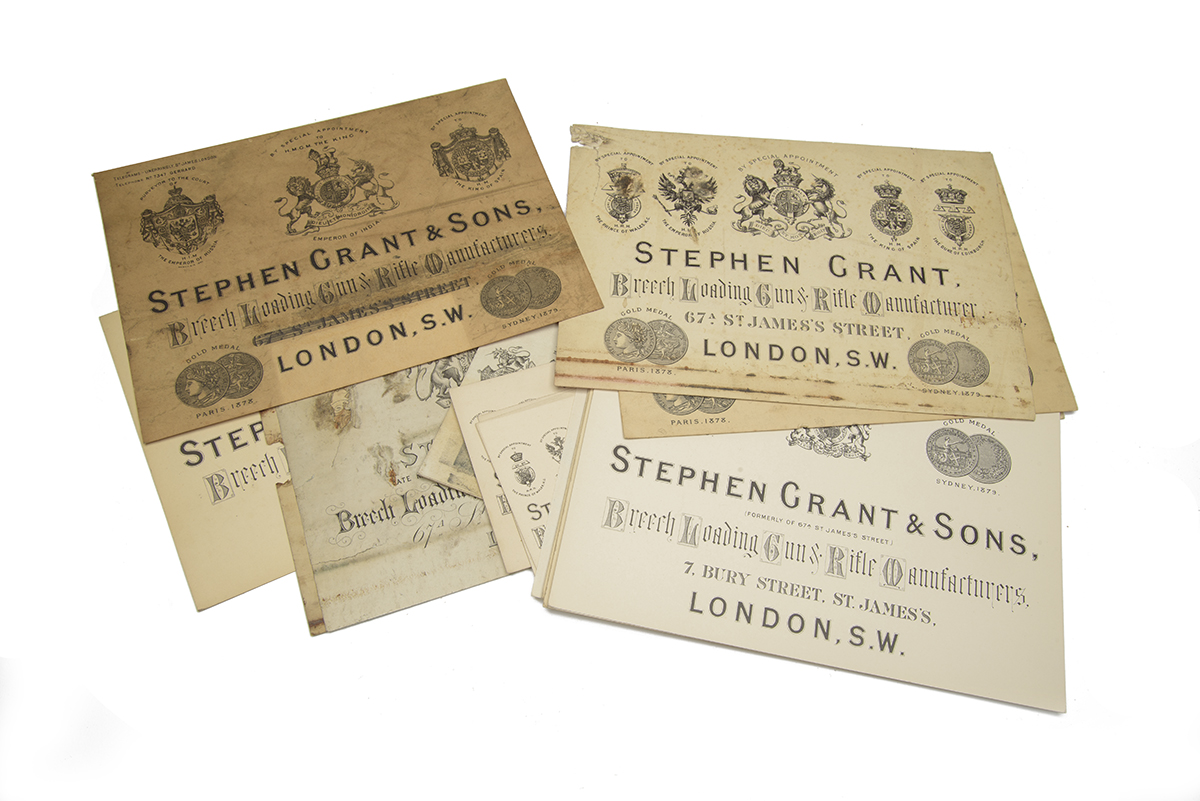 A COLLECTION OF OLD STEPHEN GRANT GUN MAKERS TRADE LABELS,
