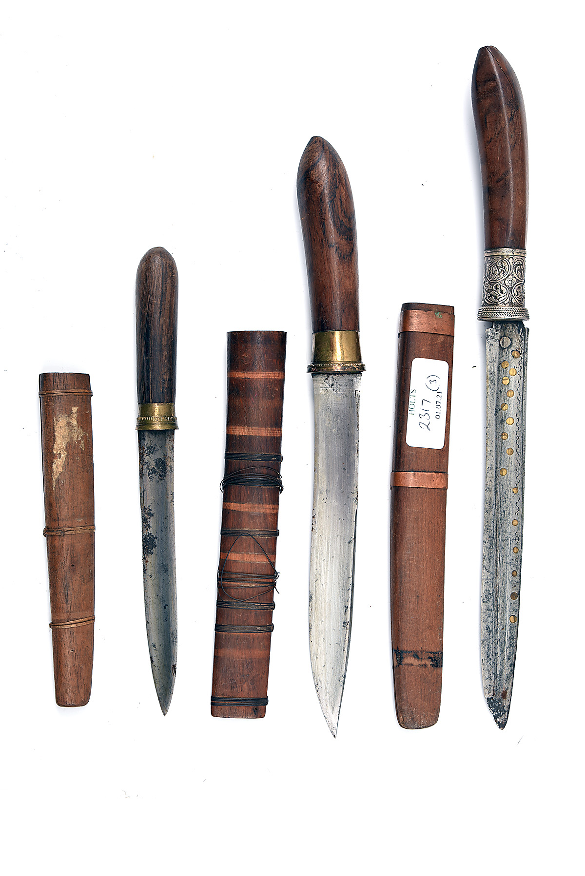 THREE WOOD-HILTED DAGGERS FROM ASSAM, all mid to late 19th century, complete with scabbards, the longest 14in. overall