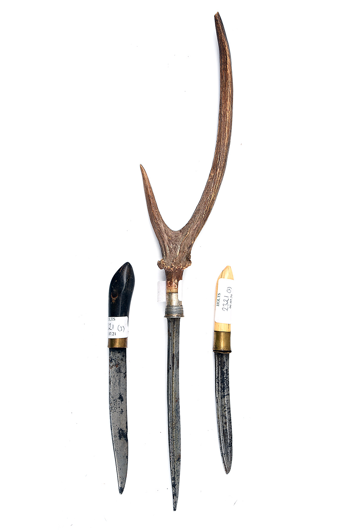 THREE SOUTH-EAST ASIAN KNIVES, all from the Assam/Burma region, all missing scabbards, one with marine ivory hilt, one with natural antler and one with wood