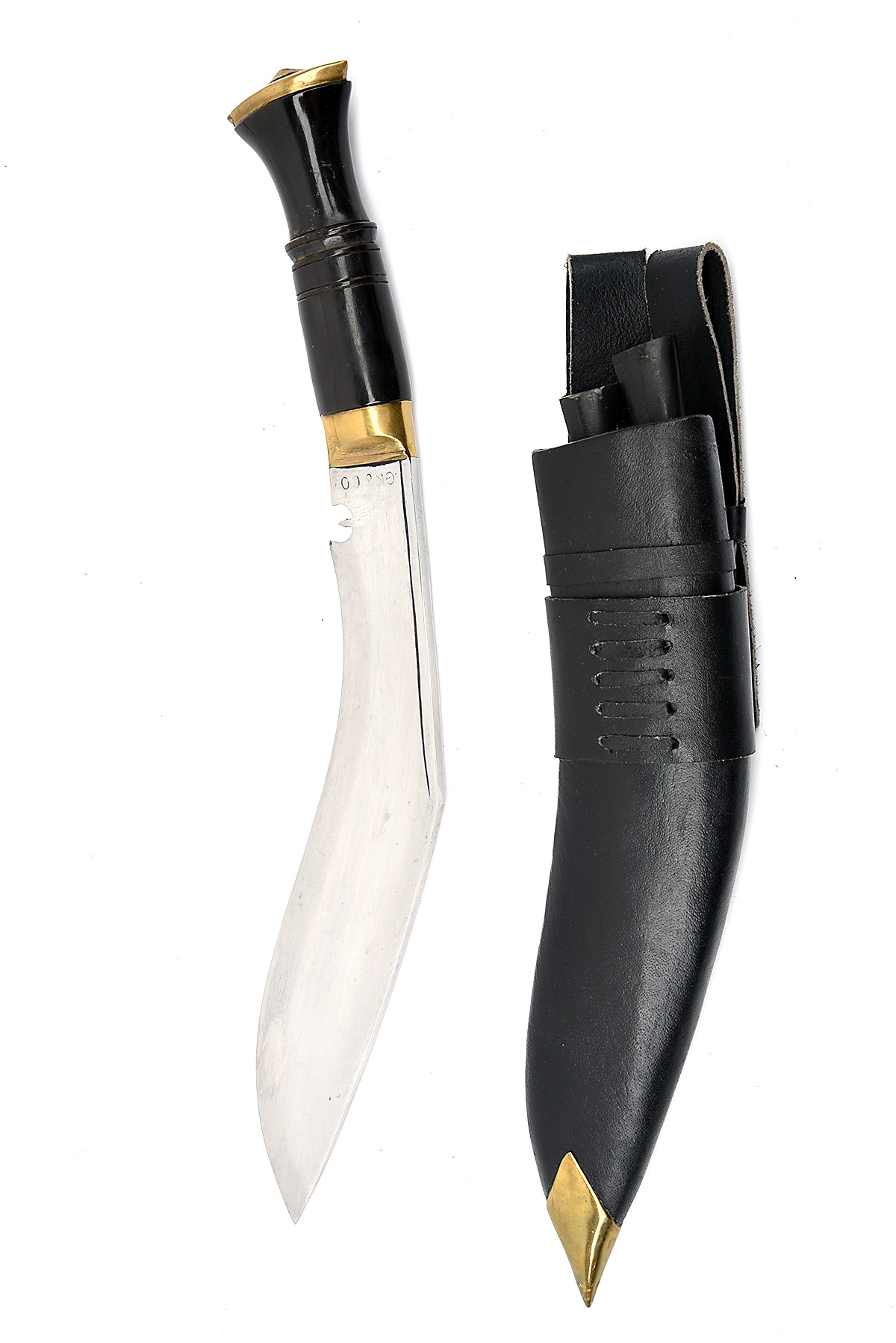 TWO SHEATH-KNIVES, the first a modern military style Ghurka kukri signed 'GK & Co.', with brass mounted black leather scabbard, the second a 'Tramontina (Brazil) 8th Air-Force' bowie with nylon scabbard, both appearing unused (no boxes), the longest 16in. overall