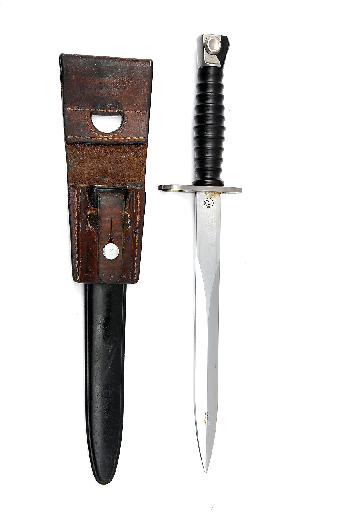 A SWISS MODEL 1957 BAYONET late 20th century, with steel blade marked 'W / 49165' on ricasso with manufacturer's mark over, black plastic grip, black plastic scabbard, brown leather frog with Swiss military and manufacturer's marks, appears unused with storage wear only, 15in. overall