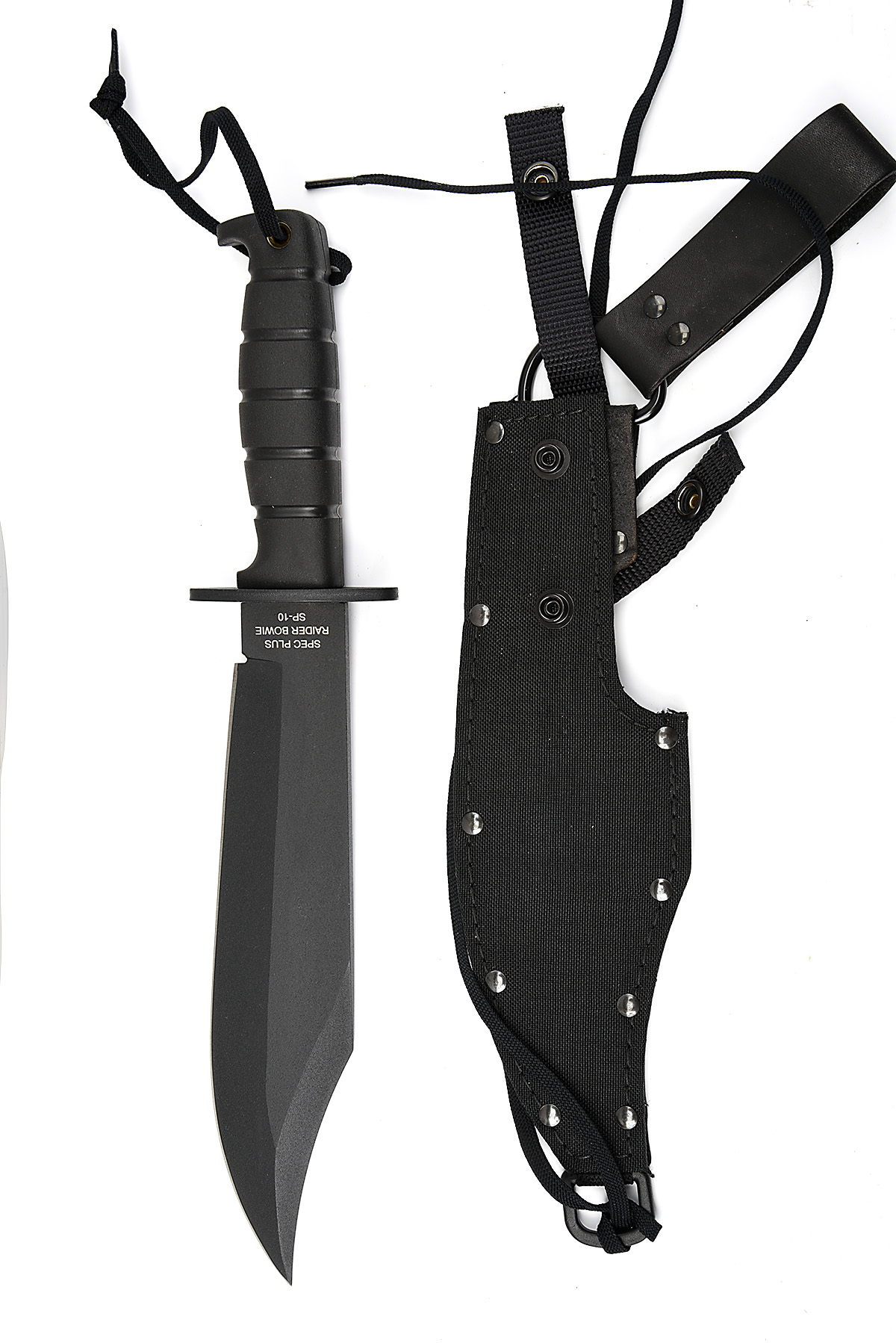 A BOXED SHEATH KNIFE SIGNED 'OKC', MODEL 'SP10 RAIDER BOWIE', with blacked 9 1/2in. blade, nylon hilt and cordura scabbard, appearing unused in its maker's carton
