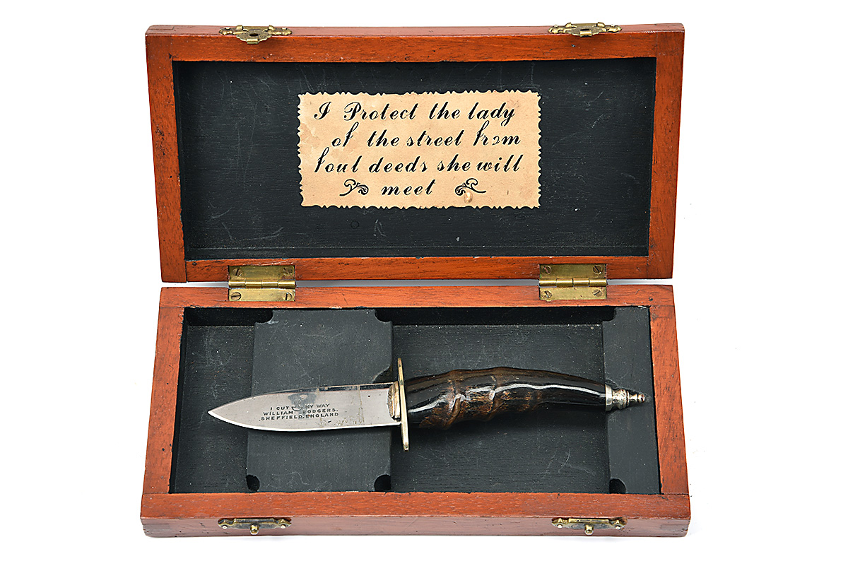 A BOXED GARTER-KNIFE SIGNED WILLIAM RODGERS, SHEFFIELD, with drop-point 2 3/4in. blade, white metal boat-shaped cross-guard and mount, natural polished horn handle, in a fitted wood box bearing a label inside the lid stating 'I PROTECT THE LADY OF THE STREET FROM FOUL DEEDS SHE WILL MEET', no scabbard