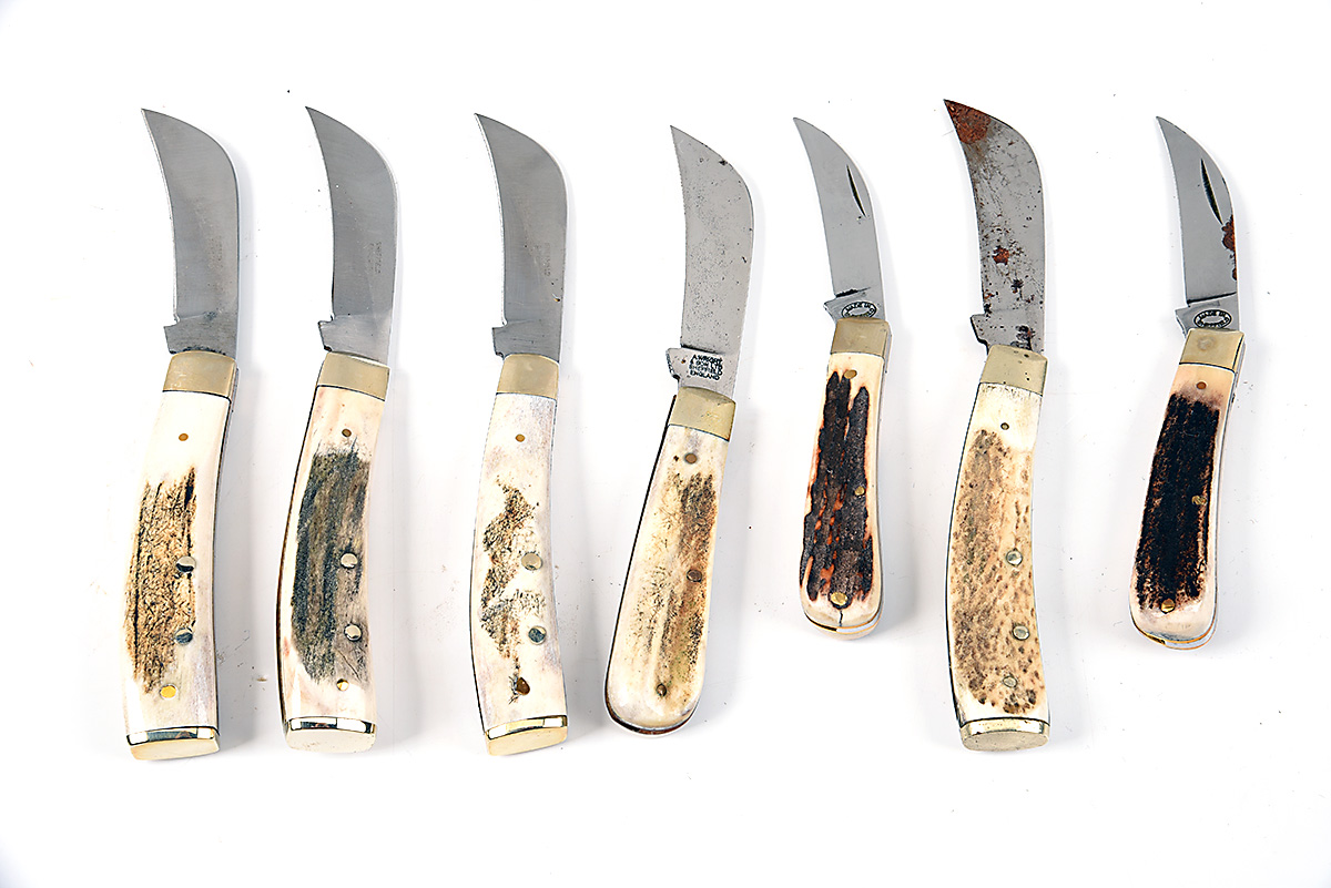 A GROUP OF SEVEN LAMBSFOOT STYLE KNIVES WITH NATURAL STAGHORN SCALES, mostly signed 'Sheffield', some storage stains