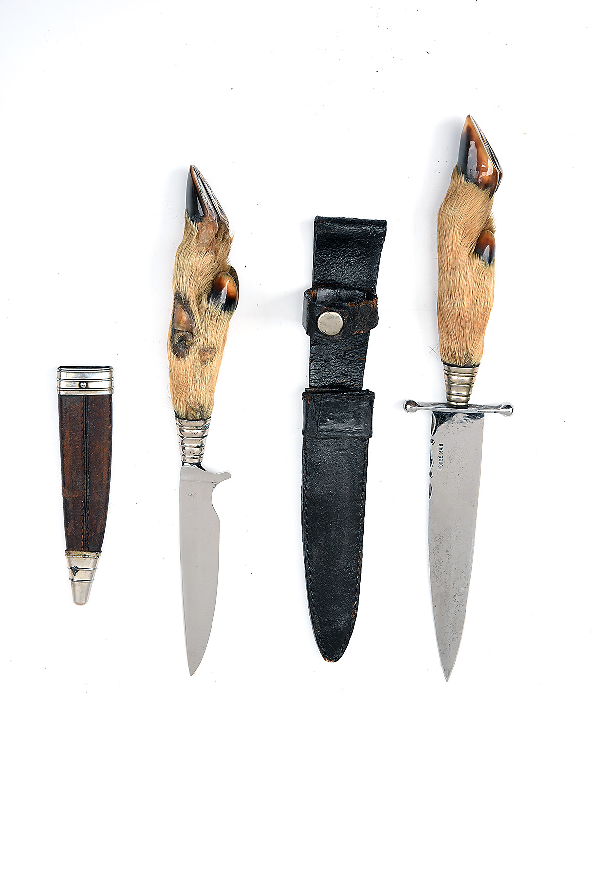 TWO TRADITIONAL GERMAN-STYLE HUNTING-KNIVES, both early 20th century, the first with straight tapering 5 3/8in. blade false edged to one side and signed 'FORGE MAIN', the second with clip-point 3 3/4in. blade, both with reverse tapering collars and natural deer-foot hilts and complete with leather scabbards