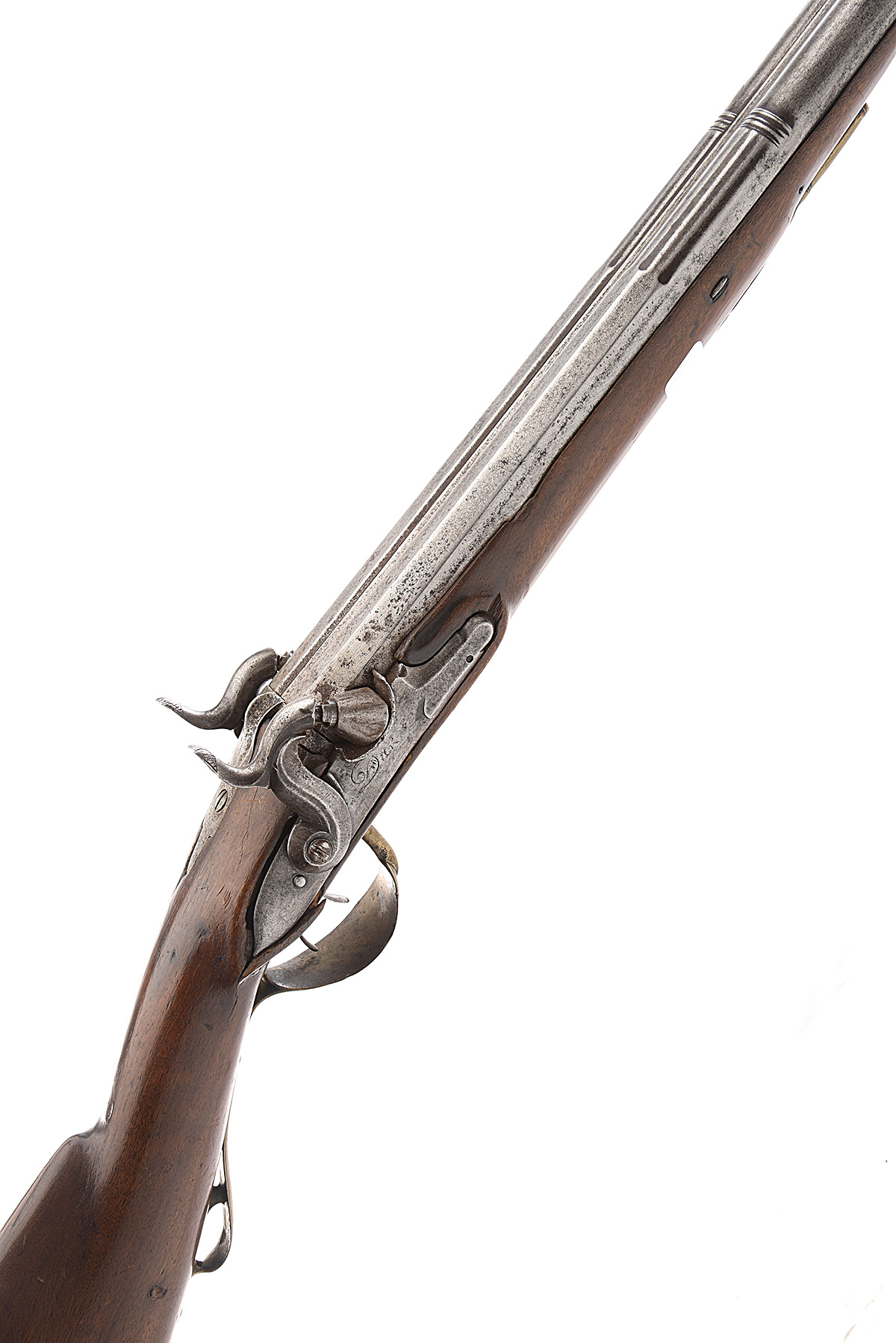 Swiss circa 1810 with later conversion to percussion, 26in. shortened triple-staged side by side barrels, plain locks signed 'DICK' on the right and 'A BERNE' on the left, walnut half-stock (cracked and repaired below locks) and brass furniture, together with a replacement iron ramrod
