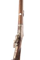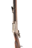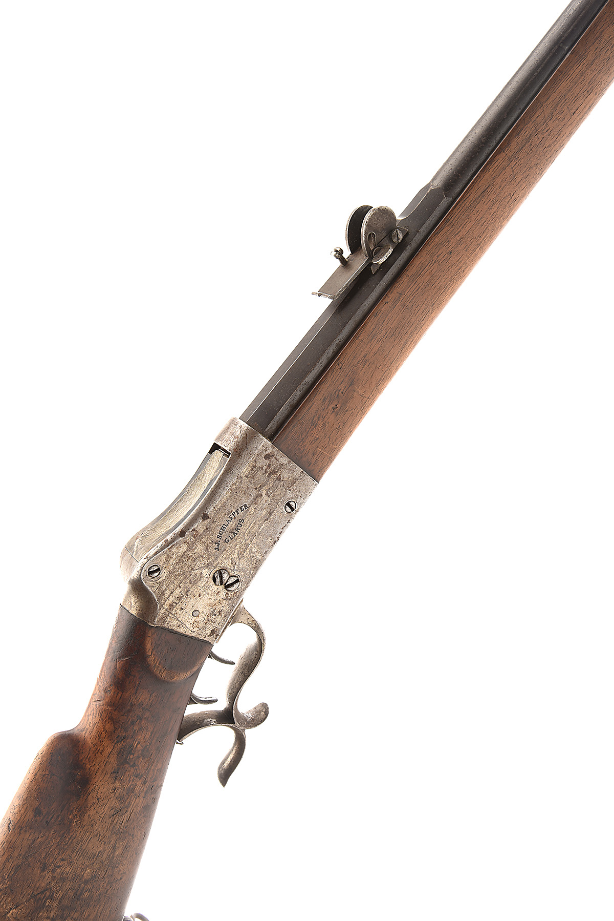 36 in. octagonal to round barrel with dovetailed block and blade front-sight, and quadrant rear-sight the action body signed on the lefts "J. J. SCHLAEPFER / GLARUS" the rifle is fitted with double set triggers and the action operating lever formed in a double scroll for grip when shooting, two piece walnut stock the forend secured to the barrel by flat keys or wedges, the butt with a cheek-rest and an iron butt-cap, rod missing.