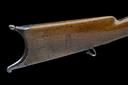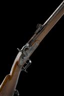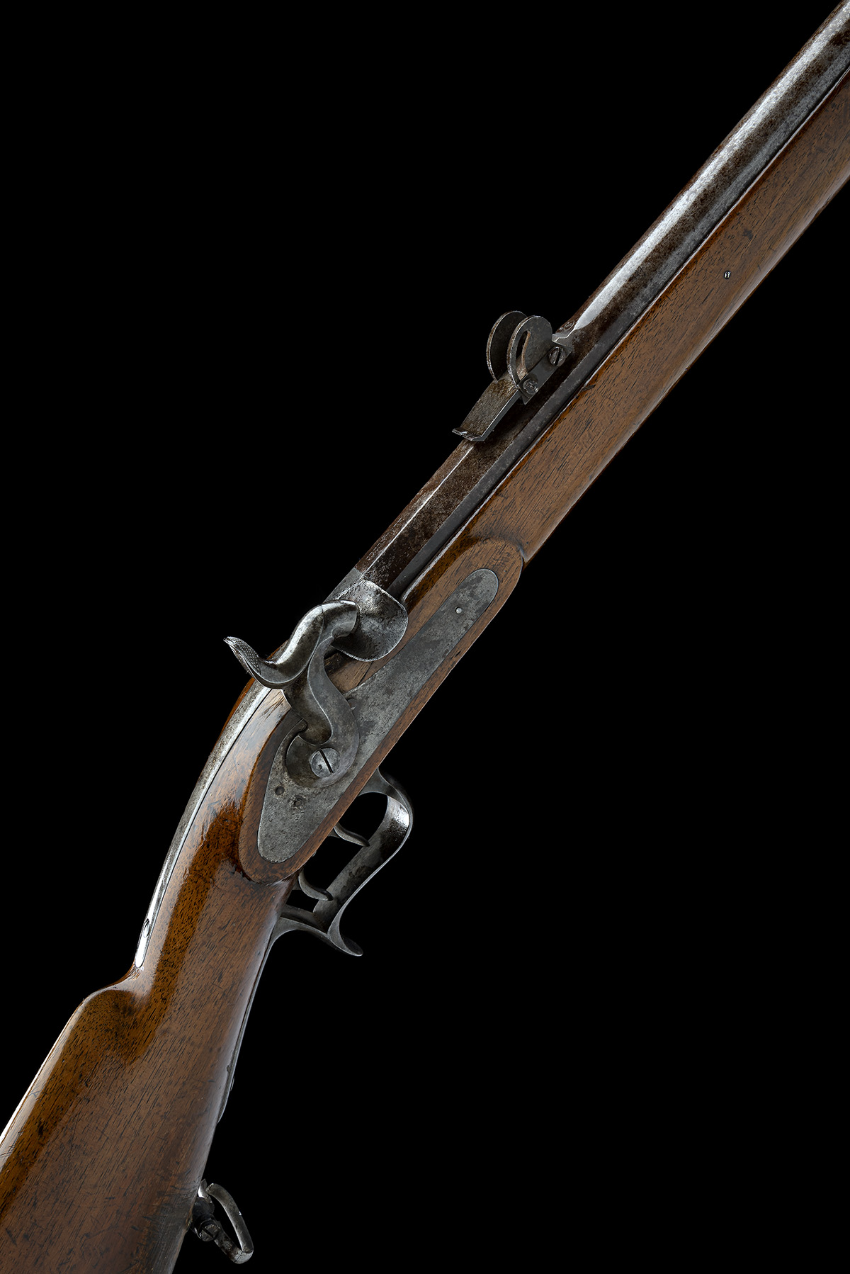 circa 1854, with octagonal to round 33in. barrel, the top-flat at breech signed 'OBERNDORF', dove-tailed blade fore-sight, elevating tangent rear-sight, long plain top-tang, plain hump-backed lock with sculpted hammer, walnut full-stock with heavy iron Swiss-style hooked heel-plate, spurred trigger guard bow, double set triggers, half length iron under-barrel ramrod pipe (ramrod missing) and traces of finish, rear sling swivel broken