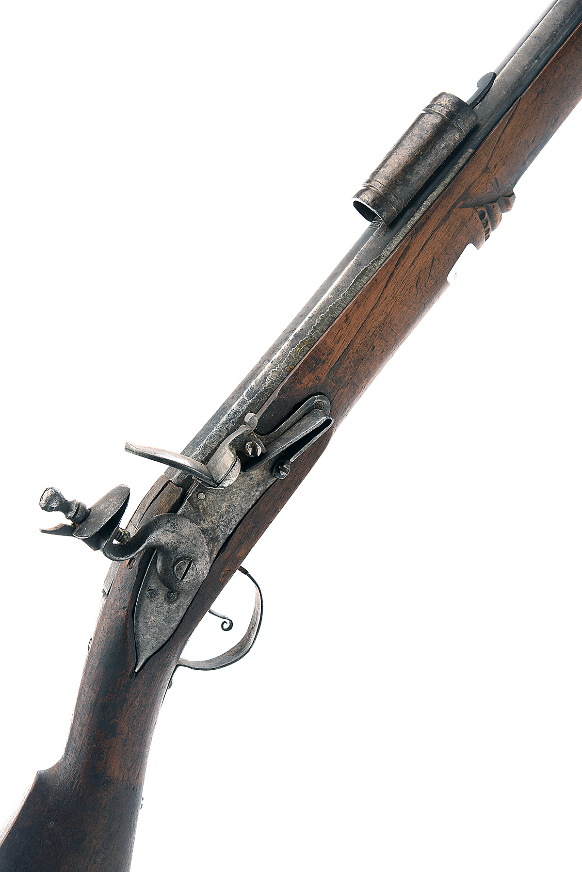 circa 1750, with swamped octagonal 38 3/4in. barrel, applied fore-sight, tunnel rear-sight, plain lock with illegible signature and bridleless frizzen, working replacement walnut full-stock and iron ramrod, small repairs and losses to wood, worn