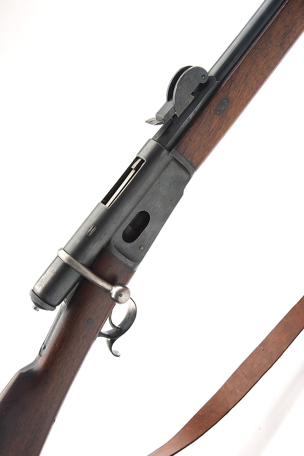 with 33in. barrel having a block and blade front-sight, quadrant rear-sight, the action stamped "WAFFENFABRIK / BERN / 198045 / M.78", two piece iron mounted walnut stock, with two barrel bands the top band with bayonet lug. The Vetterli was the worlds first bolt action repeating rifle adopted by a country for general issue.