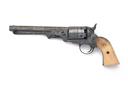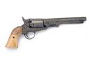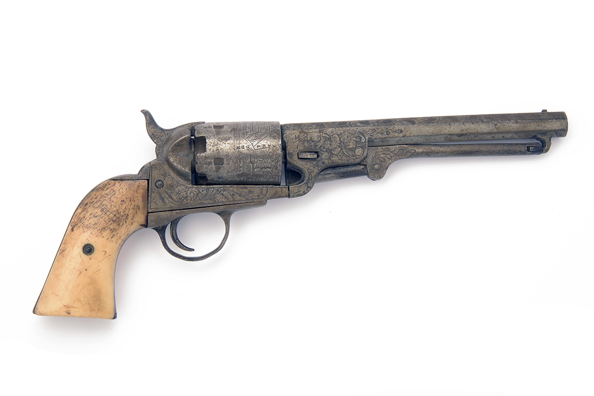 A .36 PERCUSSION FIVE-SHOT REVOLVER SIGNED COLT'S SYSTEM, MODEL 'BREVETE', serial no. 104454, Spanish made circa 1870, with octagonal 6in. barrel signed 'COLT 'S SYSTEM MANUFACTURED BY C. CLEMENTE' (last word obscured), roll engraved plain cylinder, open iron frame, brass trigger-guard and grip-straps, bone grip and open foliate engraving throughout, worn, action at fault