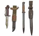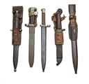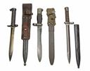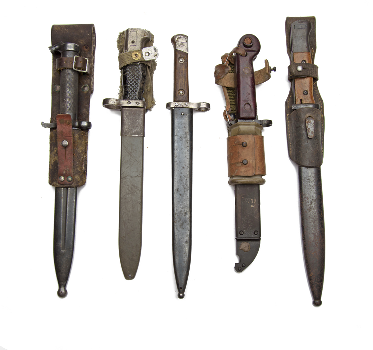 ** A GROUP OF FIVE MIXED MILITARY BAYONETS, 20th Century, being 1) an AKM Type I, with 6 in. clipped point steel blade, edged to one side and serrated to the other, black steel cross-guard, brown plastic hilt, belt-strap, 'wire-cutter' steel scabbard, rubber throat sleeve, brown leather and green canvas frog 13 1/4in. overall; 2) s Spanish Toledo INI Bolo for the CETME assault rifle, 9 in. single-edged steel blade, ricasso with Spanish eagle one side and 'ET18418D', with Toledo trade-mark plus INI over, with combined green plastic scabbard and canvas frog, 14 in. overall; 3) a Swedish M96 Mauser, 8 1/4 in. double-edged steel blade with narrow fullers on each side, tubular steel hilt with engine-turned grip, black steel scabbard, brown leather frog, 15 1/2 in. overall; 4) Austro-Hungarian M1895 Mannlicher, 9 3/4 in. single-edged steel blade fullered on each side, steel cross-guard and hilt with wooden grips, black steel scabbard, 14 3/4 in. overall; German K98k Mauser, 10 in. black steel single-edged blade fullered on each side, ricasso dated '40' with indistinct manufacturer's mark and '4829 / h' over, steel hilt with wooden grips, black steel scabbard and black leather frog, 17 in. overall; all worn and tired, with rust patches