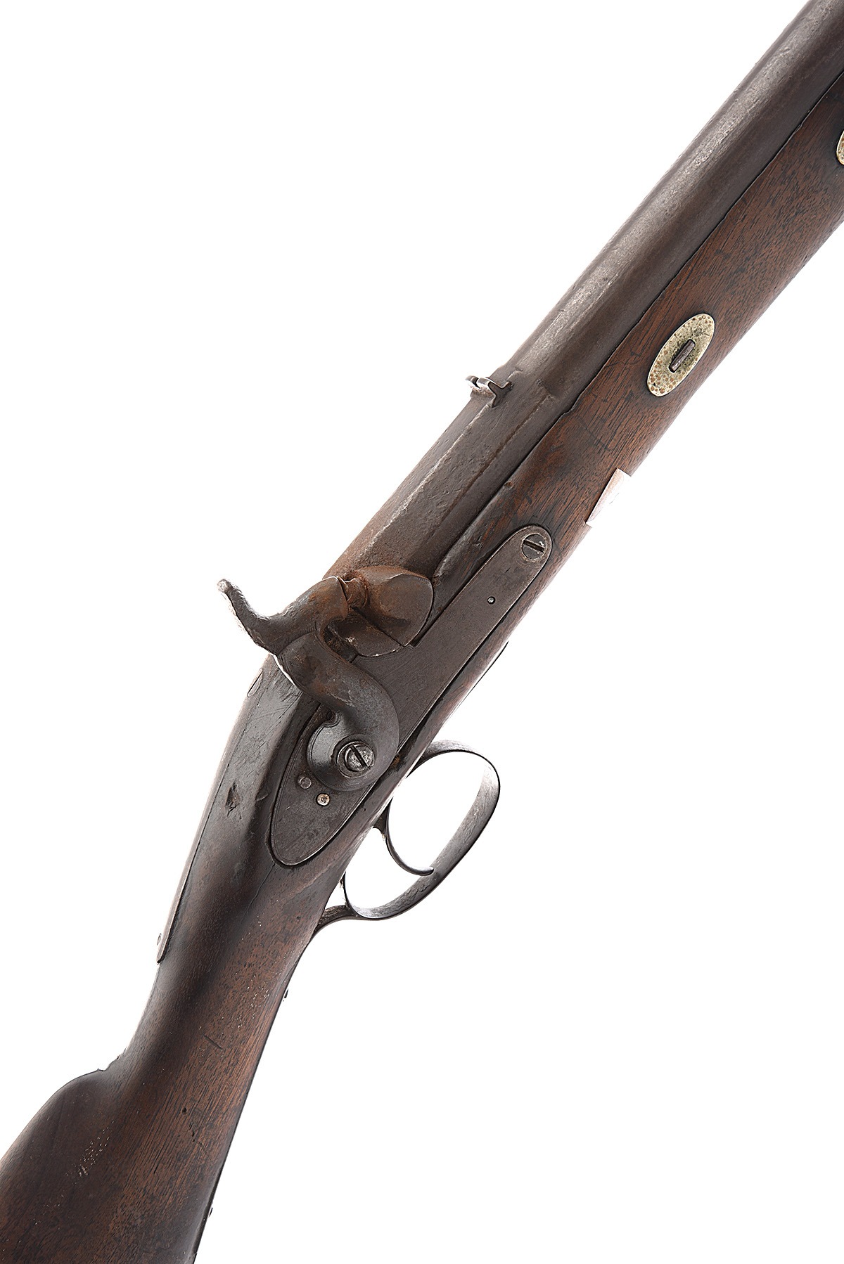 * A 6-BORE PERCUSSION SINGLE-BARRELLED BALL-GUN, UNSIGNED, no visible serial number, circa 1855, with 26 1/2in. sighted round barrel, bar-action lock and walnut half-stock, heavily worn throughout with native repairs and losses to furniture, provision for ramrod removed