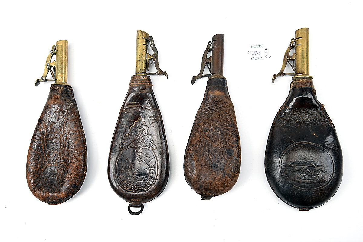A COLLECTION OF FOUR MID 19TH CENTURY ENGLISH PATTERN LEATHER BODIED SHOT FLASKS, all with operational spouts, bodies worn, some missing neck-screws