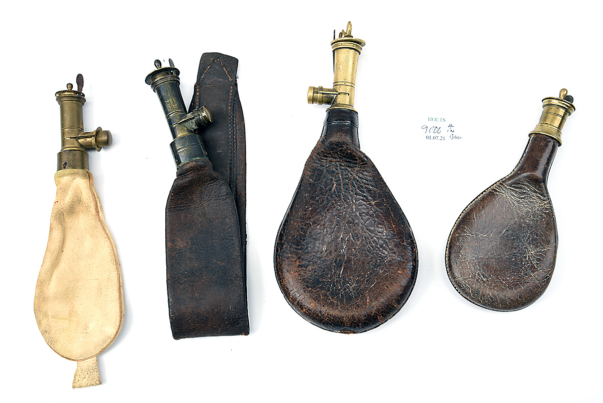 A COLLECTION OF FOUR MID 19TH CENTURY AND LATER IRISH PATTERN LEATHER BODIED SHOT FLASKS, two of bag-shape, one in suede (probably early 20th century) and one cut from a shot-belt